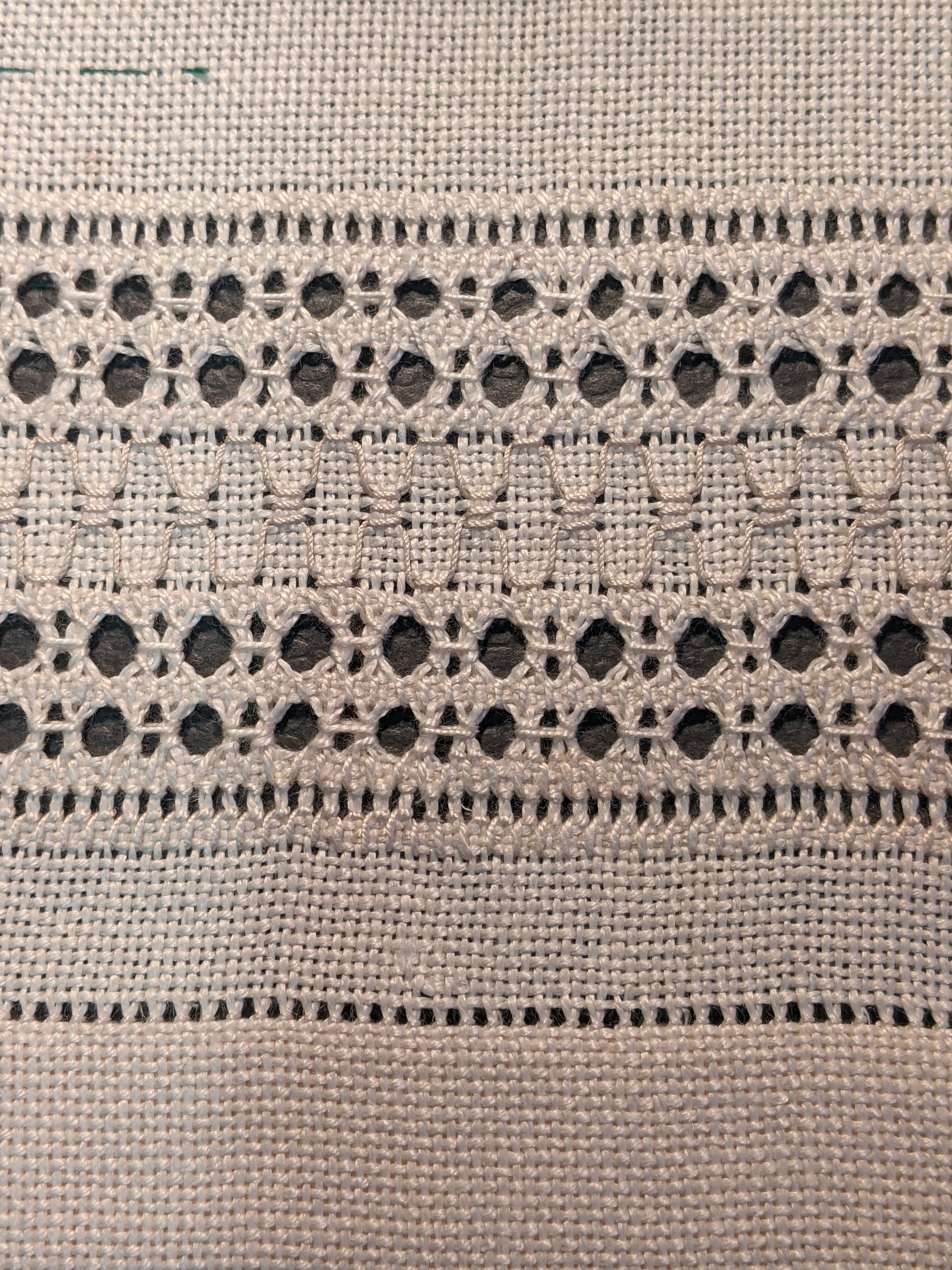 AUSSPARTECHNIK: handgewebter Stoff wird ausgespart um Durchbrucheffekte zu erreichen, wird oft mit Stickerei kombiniert
