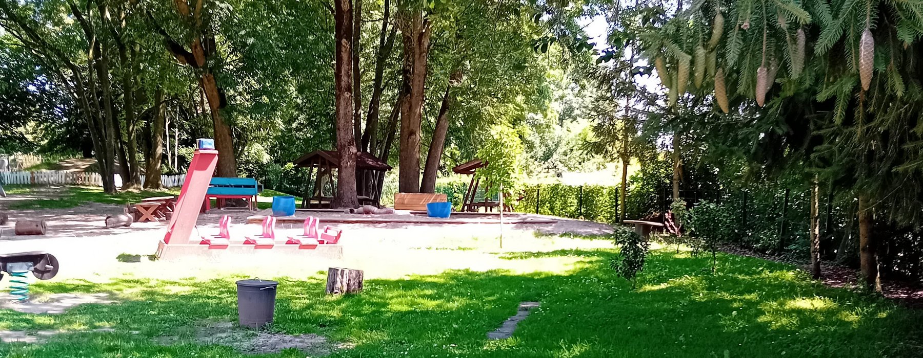 Das Außengelände der Einrichtung hat einen typisch dörflichen Charakter mit ausreichender natürlicher Beschattung. Den Kindern stehen Kletter- und Schaukelelemente, Sandkisten sowie Rollenspielelemente, zum Beispiel zum Thema Feuerwehr, Bäckerei oder Eisenbahn, zur Verfügung. Für Abwechslung beim Spielen sorgen Wipptiere, Balancierbalken, Musik- und Malwände und ein kleines Fußballfeld. Für die Kleinsten gibt es eine Sandkiste, eine Bewegungslandschaft mit Brücke, Podesten, einem Tunnel und Balancierbalken sowie eine Matschanlage.