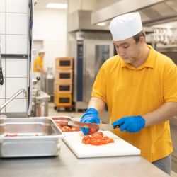 Täglich werden hier bis zu 600 Mittagessen frisch zubereitet. Externe Gäste, Beschäftigte und Mitarbeitende können zwischen drei verschiedenen warmen Gerichten wählen. Das Essen I hält ein Tagesangebot für Sie bereit, bei Essen II dürfen Sie sich auf ein vegetarisches Gericht freuen und Essen III kommt aus der gut bürgerlichen Küche. Außerdem können Sie sich an unserem Frischebuffet von unserem Kantinenpersonal Ihren Wunschsalat individuell zusammenstellen lassen.
