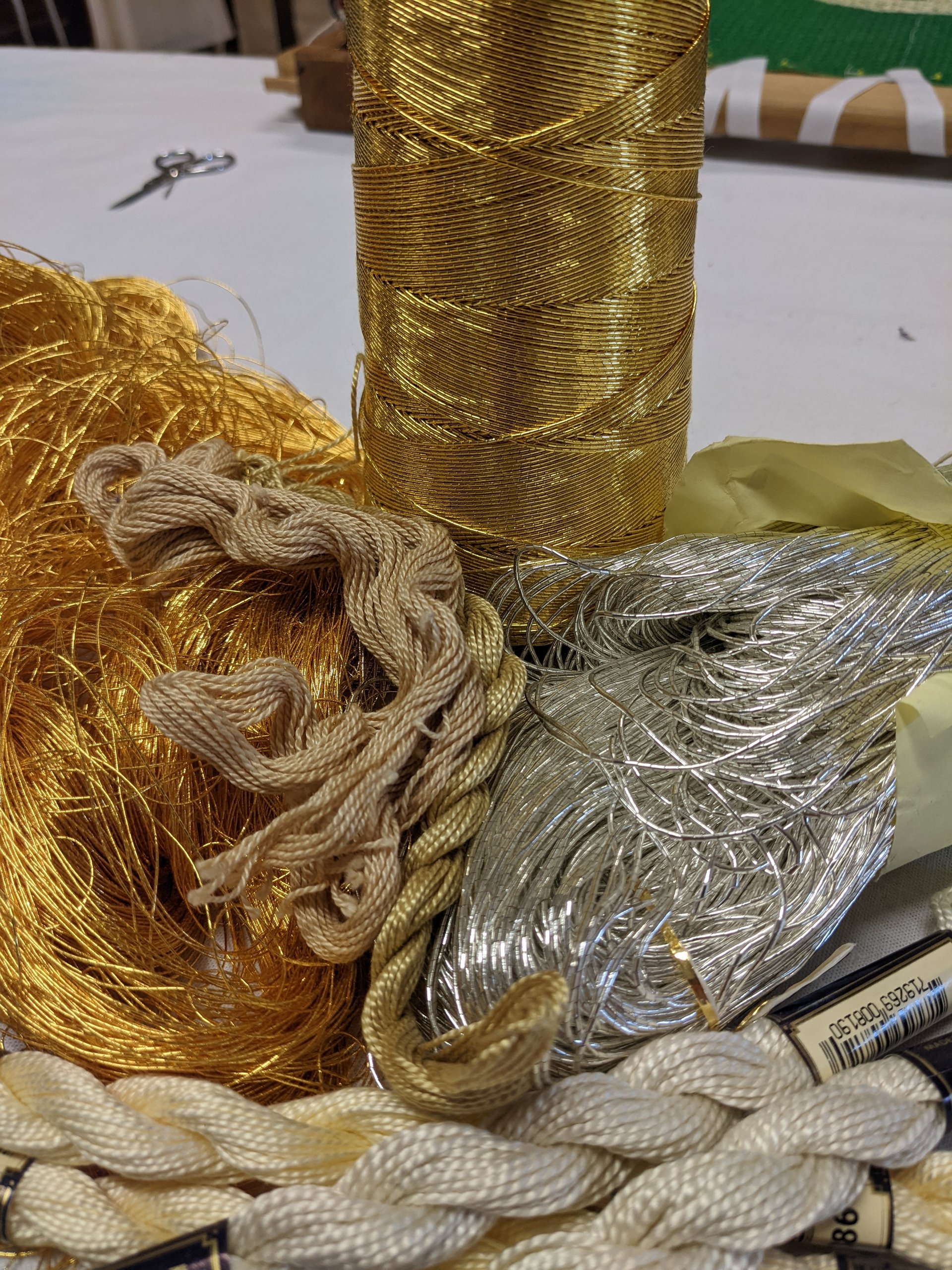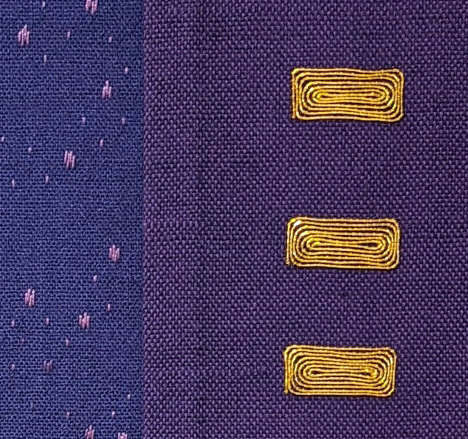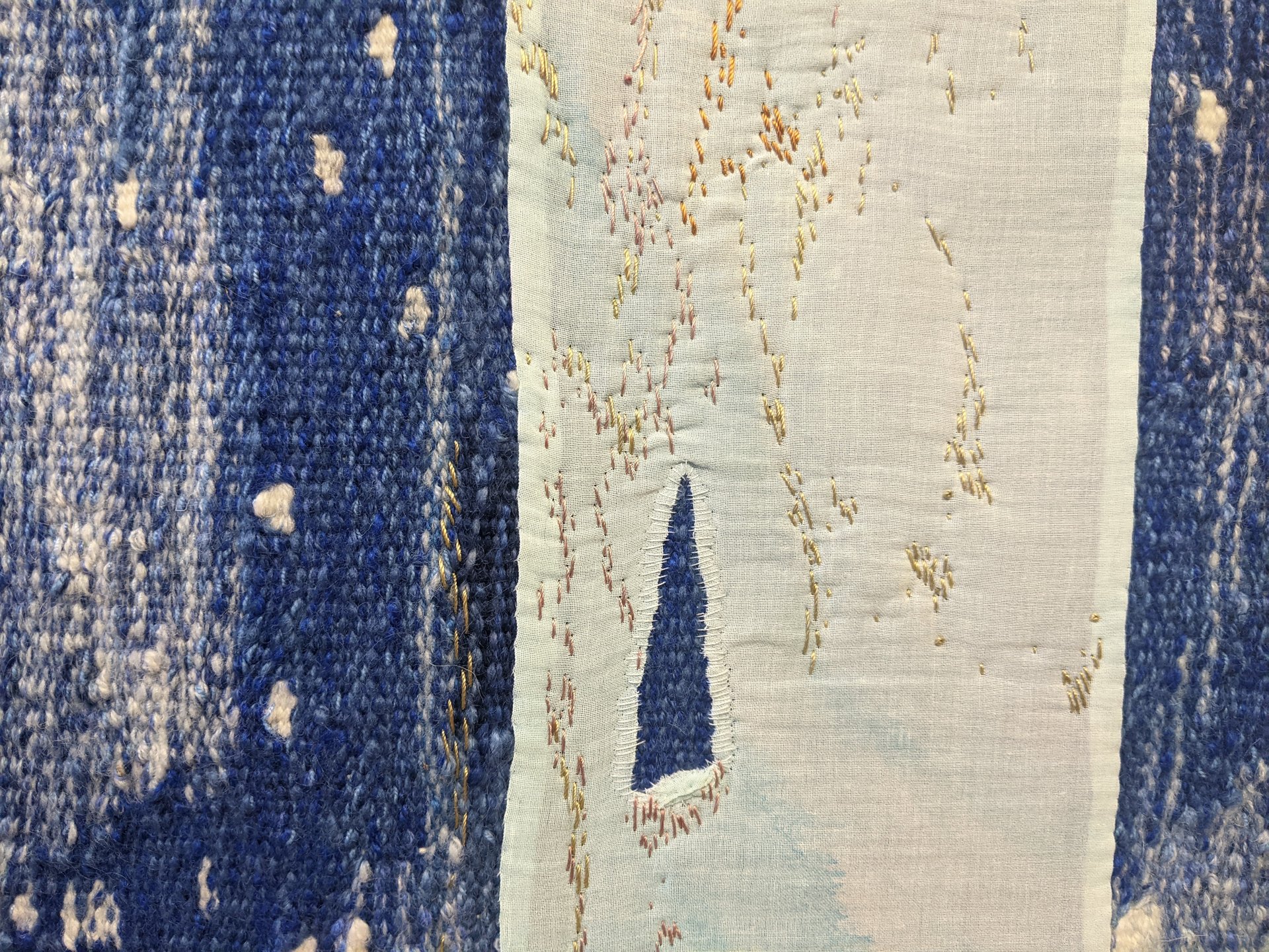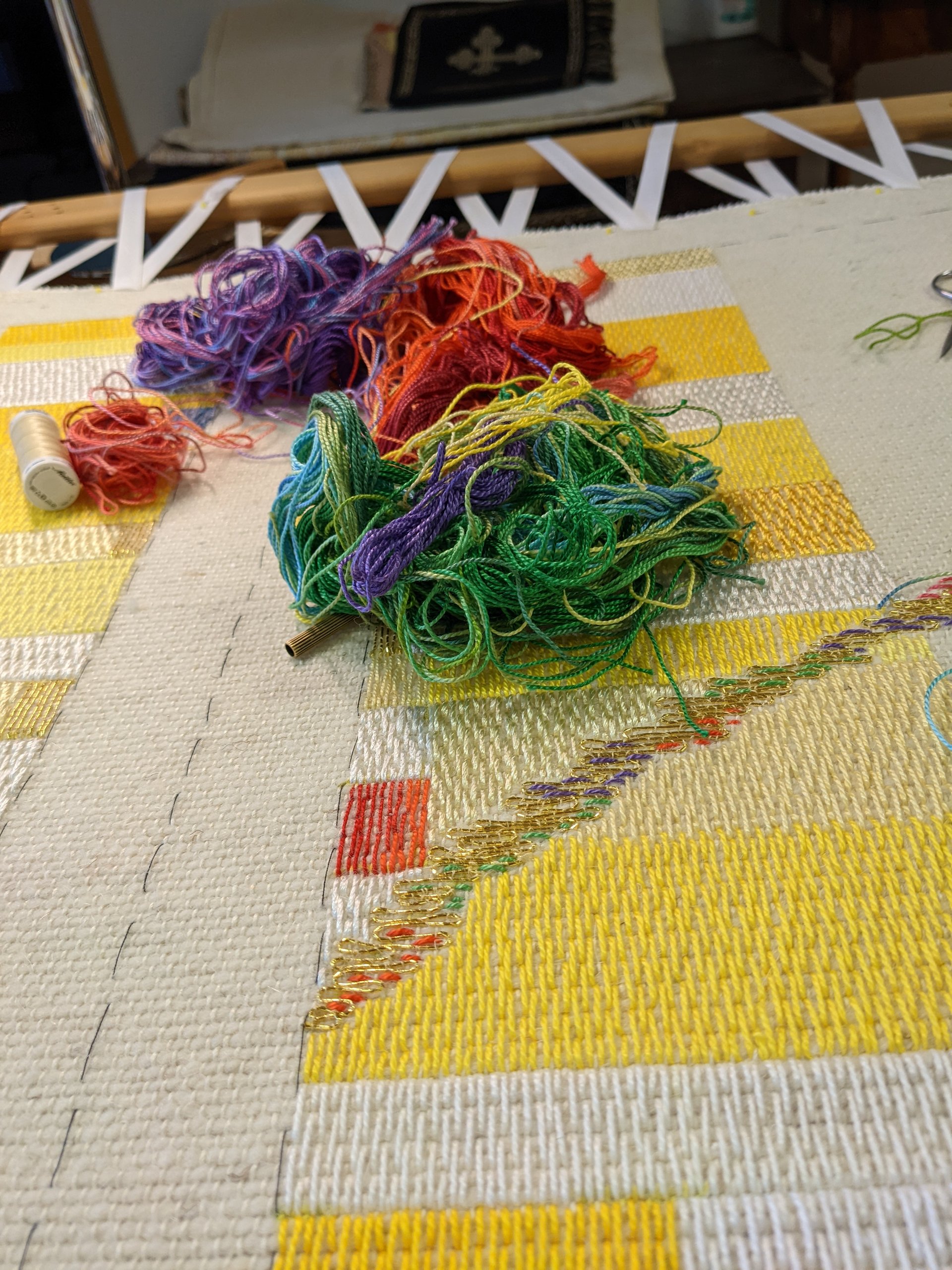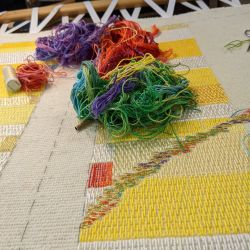 STICKEREI: freie oder bindungsbezogene Stickerei in Wolle oder Baumwolle/ Leinen und Gold auf handgewebtem Grundstoff