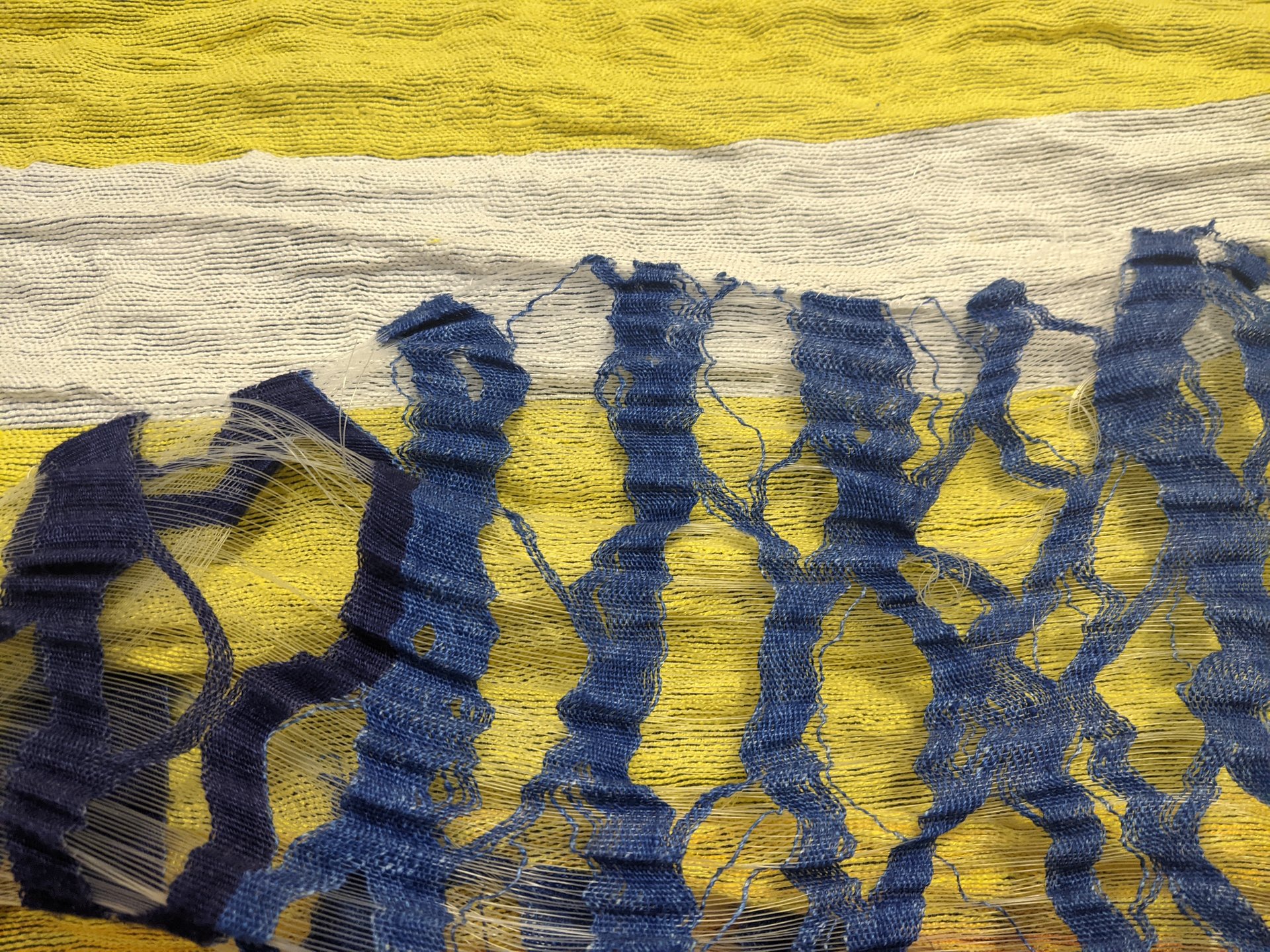 AUSSPARTECHNIK: handgewebter Stoff wird ausgespart um Durchbrucheffekte zu erreichen, wird oft mit Stickerei kombiniert