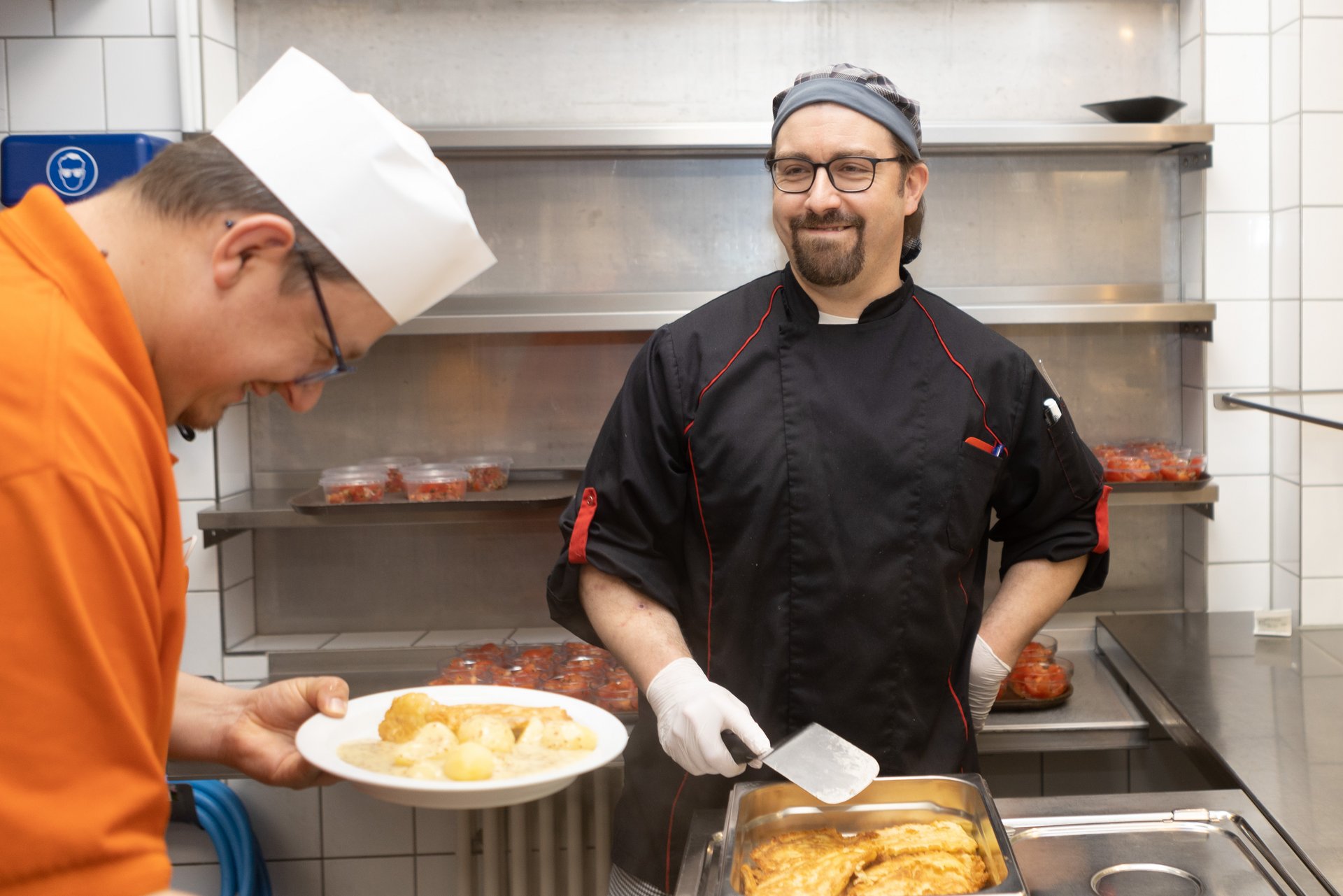Täglich werden hier bis zu 600 Mittagessen frisch zubereitet. Externe Gäste, Beschäftigte und Mitarbeitende können zwischen drei verschiedenen warmen Gerichten wählen. Das Essen I hält ein Tagesangebot für Sie bereit, bei Essen II dürfen Sie sich auf ein vegetarisches Gericht freuen und Essen III kommt aus der gut bürgerlichen Küche. Außerdem können Sie sich an unserem Frischebuffet von unserem Kantinenpersonal Ihren Wunschsalat individuell zusammenstellen lassen.